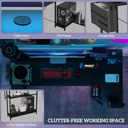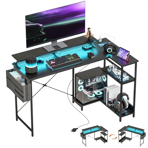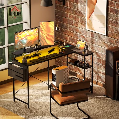 HOMCOM 58″ L Shaped Gaming Desk with Power Outlets and LED Lights, Reversible Computer Desk with Monitor Stand, Fabric Storage Bag, Cable Management, for Home Office, Black