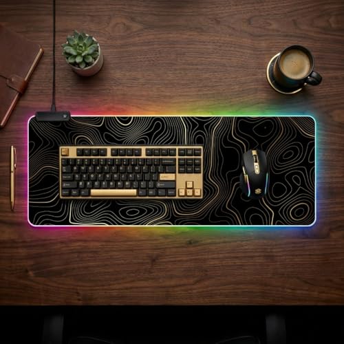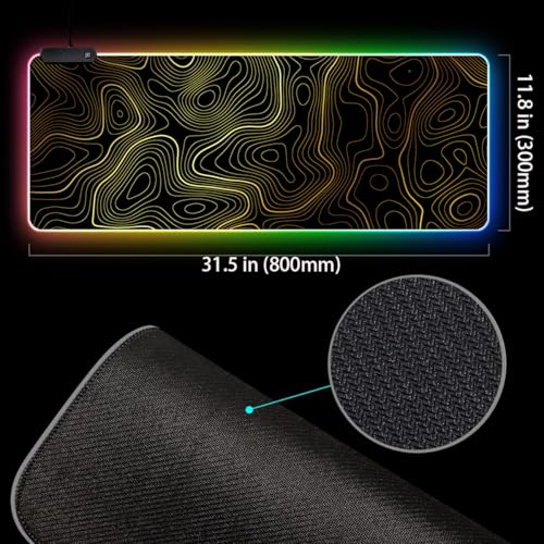 RGB Mouse Pad LED Desk Mat Large Gaming Mousepad Black and Gold Line Design, Keyboard Pad XL Mouse Mat for Home and Office (Black with Gold Topographic Line)